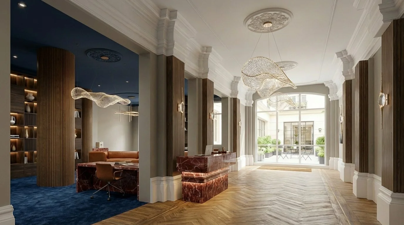 A high-resolution photorealistic render showing materials, lighting, and finishes.